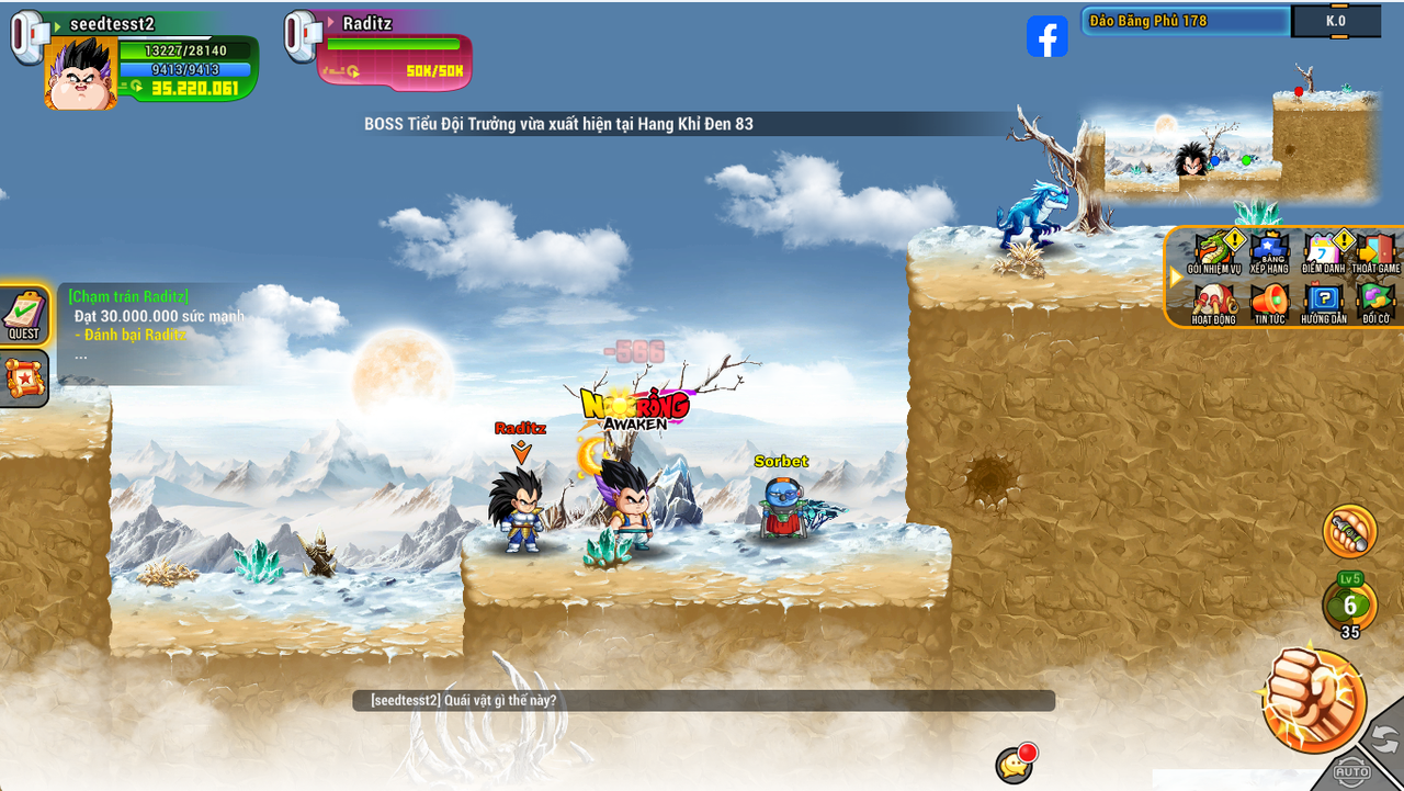 Sau khi đạt 30tr sm click vào nhiệm vụ, nhân vật tự động di chuyển đến chỗ có raditz, raditz sẽ tự động xuất hiện 1 phút sau khi bị tiêu diệt ( lưu ý ; raditz khá mạnh các chiến binh lên sử dụng kèm theo cuồng nộ, bổ khuyết và giáp sên )