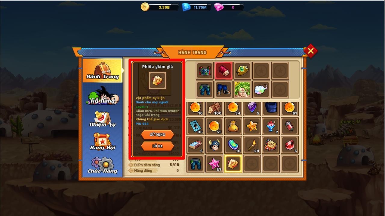 Phần thưởng: Phiếu giảm giá 80%, Vàng, TNSM, Ngọc Rồng