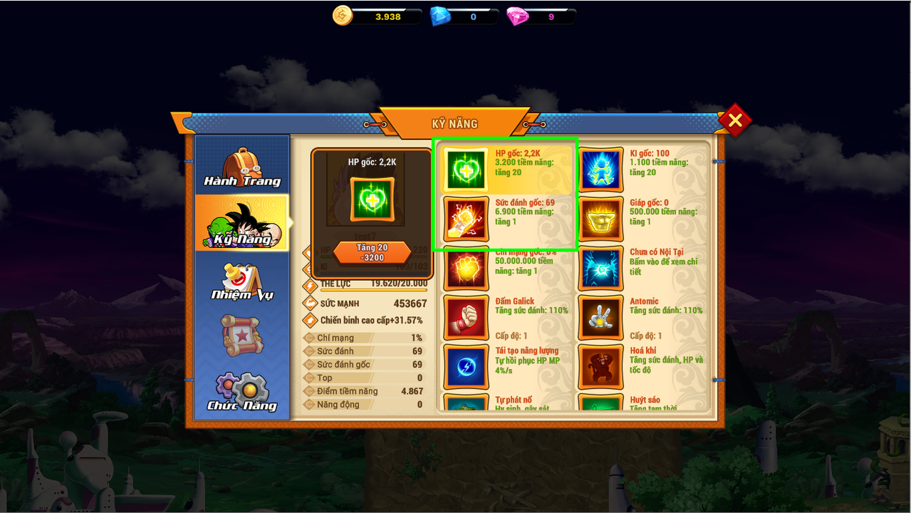 - Sử dụng ngọc rồng 3 sao để ước 2tr điểm sức mạnh