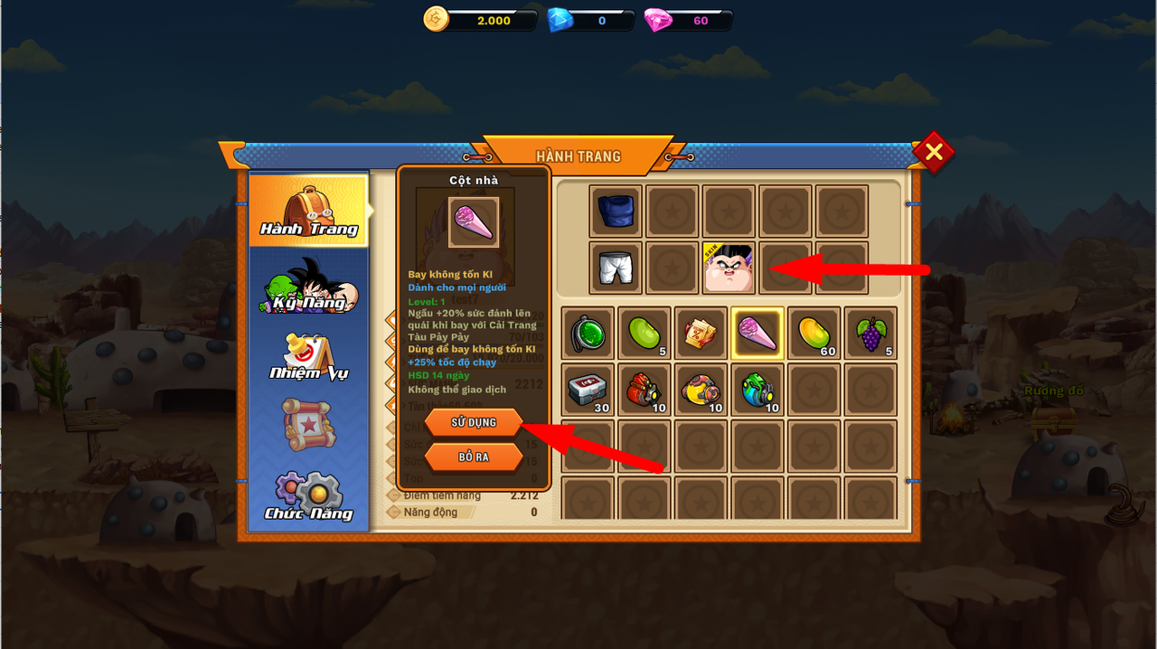 - Sử dụng các vật phẩm được tặng trong quà tân thủ: Cải trang Gotenks, Phụ kiện bay, Danh hiệu Ngọc Rồng Awaken