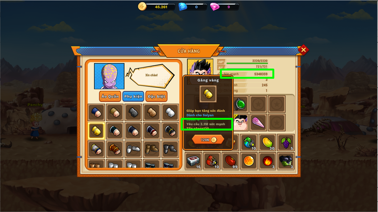 - Tìm NPC Bulma, Appule, Dende, Kuriza (tùy từng hành tinh mà các NPC này sẽ bán trang bị tương ứng) ở trước nhà. Chọn mua trang bị phù hợp với sức mạnh hiện có đăng tăng khả năng chiến đấu.