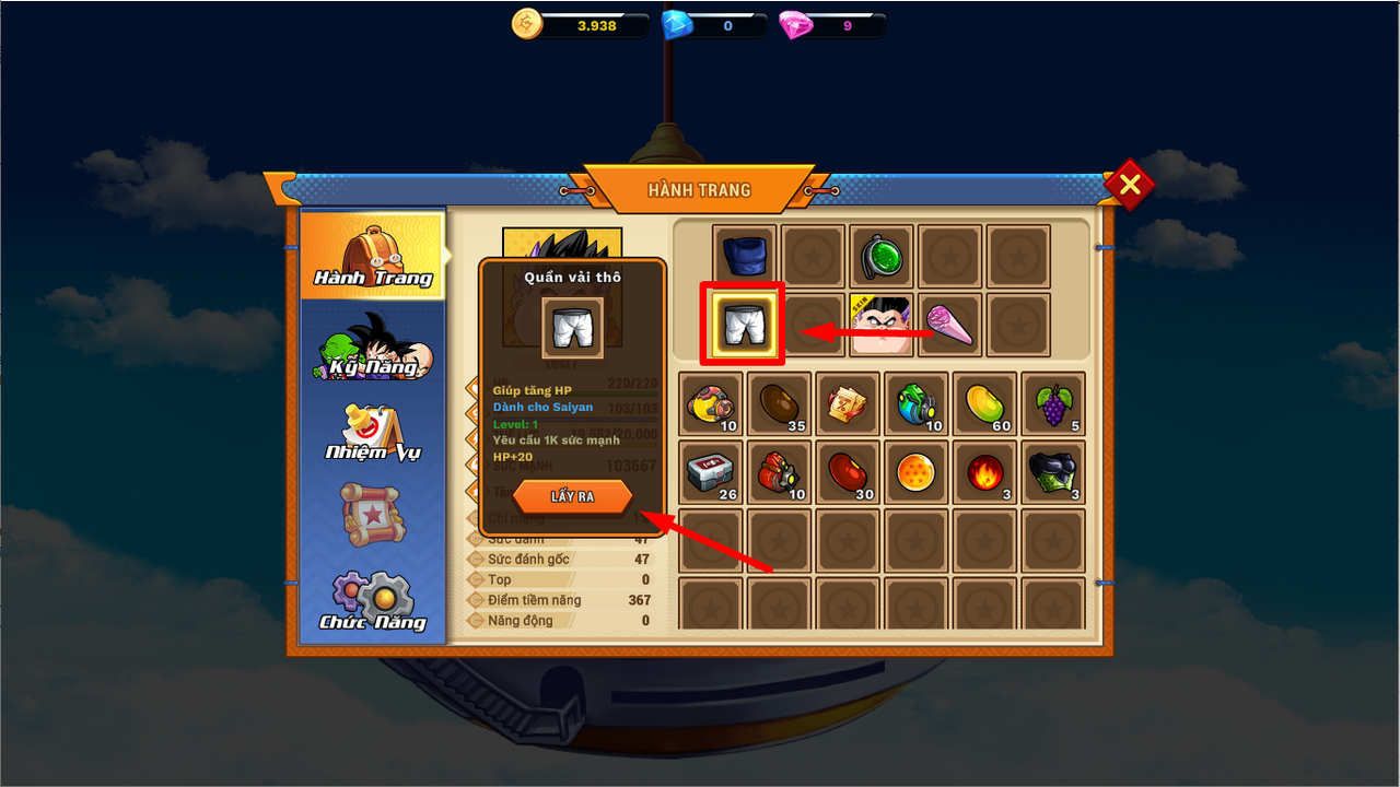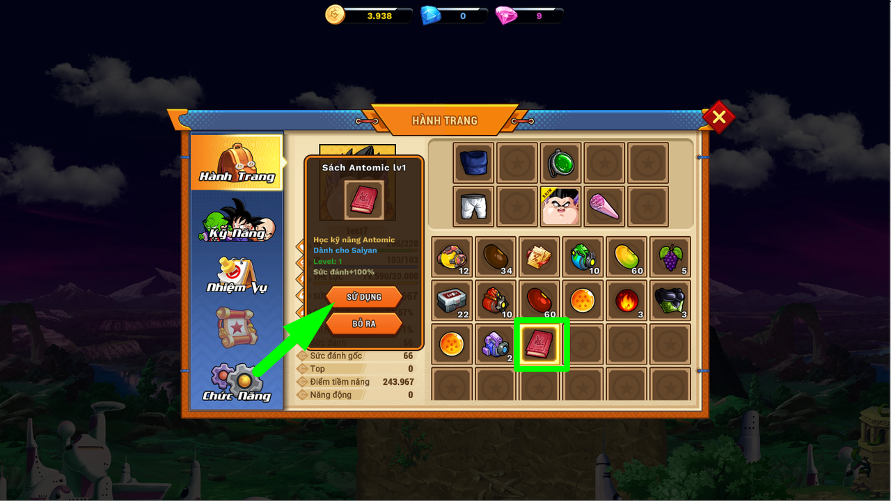 Vào Hành trang chọn viên ngọc rồng 3 sao và ấn sử dụng