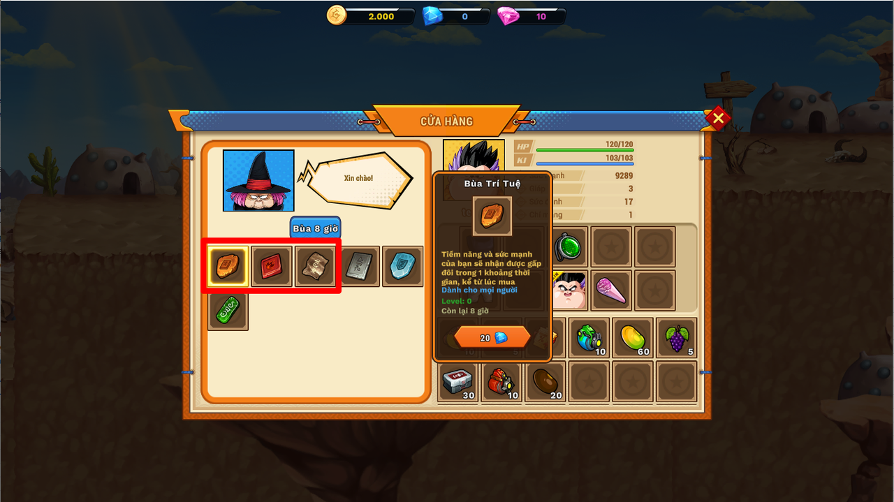 Mua 3 bùa Trí tuệ, Mạnh mẽ, Da trâu tại NPC Phù Thủy Hạt Mít