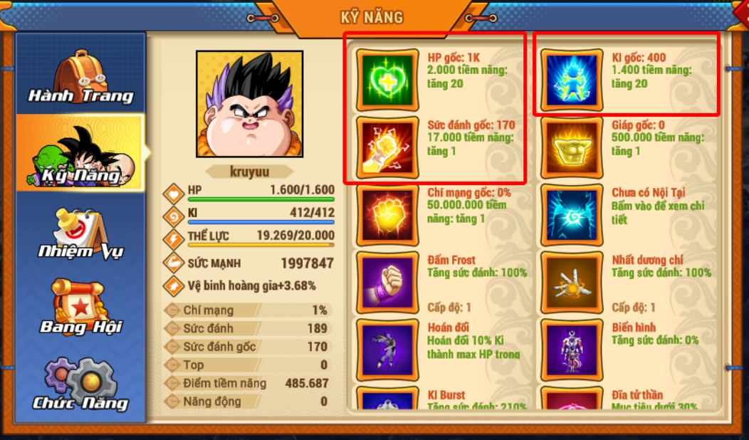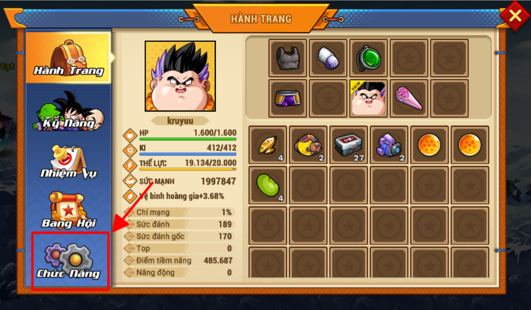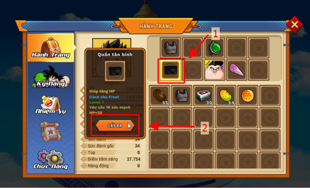 *Ưu tiên nâng kĩ năng đấm lên tối đa có thể để tăng sức đánh lên quái (nhớ cân đối lượng KI hiện có) Bước 9: Tân trang lại trang bị, kiểm tra các vật phẩm bổ trợ