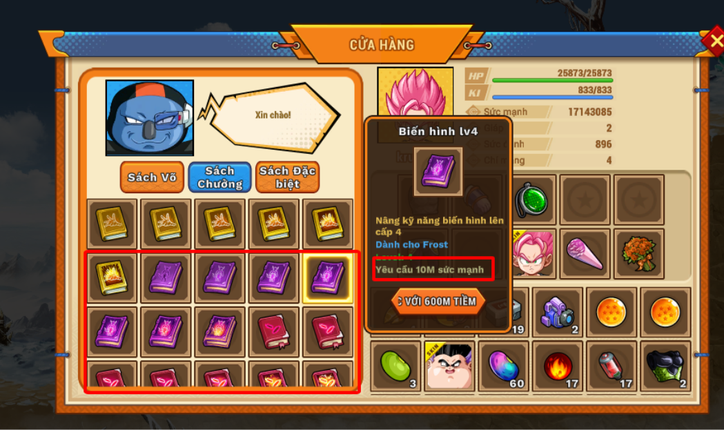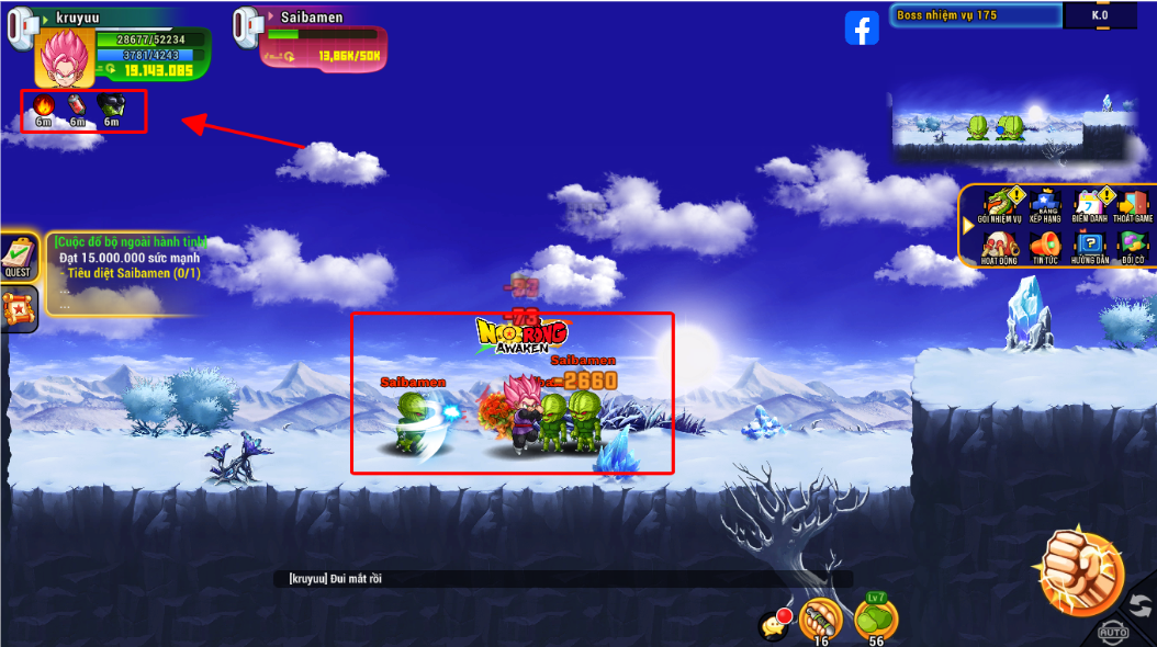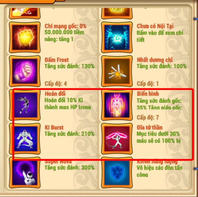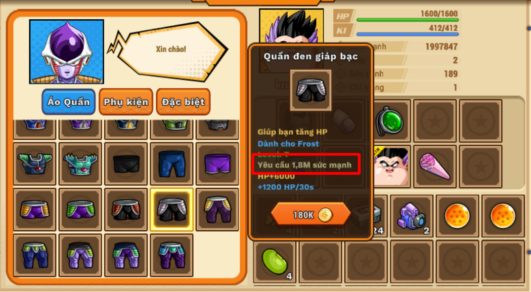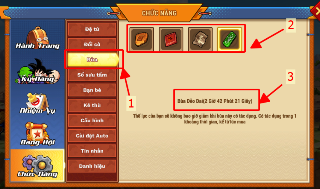 - Sử dụng thêm cuồng nộ + bổ huyết + giáp xên để đánh boss radiz,saibamen,nappa,vegeta dễ hơn (item có thể lấy trong gói mua chung hoặc gói battle pass)
