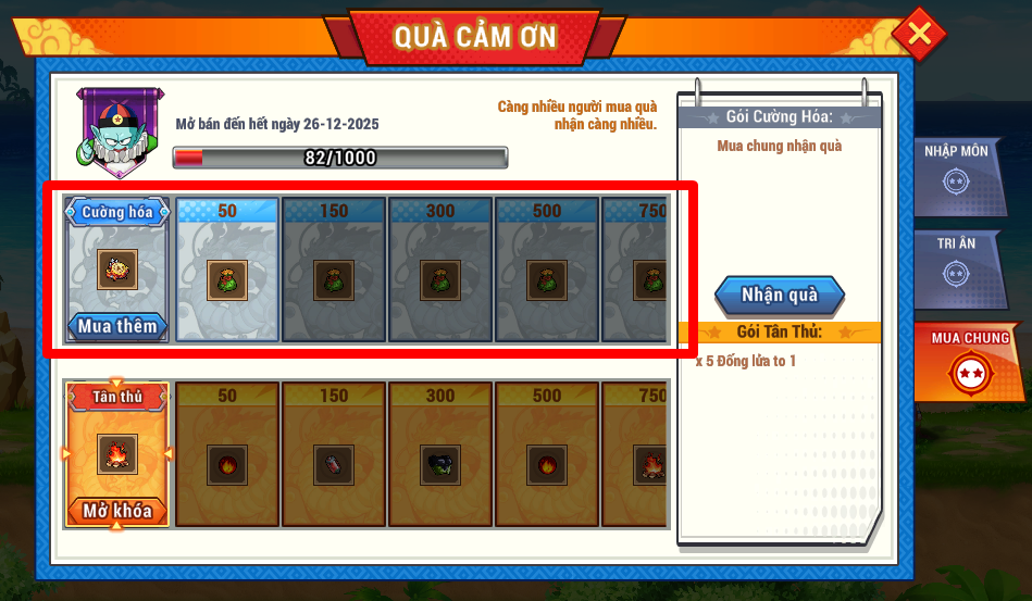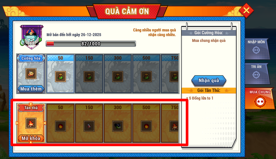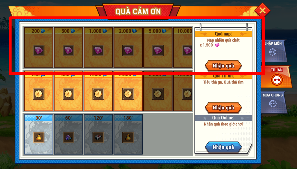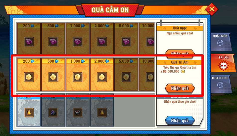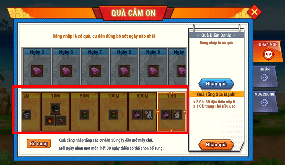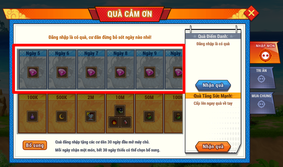 - Người chơi nạp đạt mốc tích lũy sau sẽ nhận được phần thưởng tương ứng. Đặc biệt nạp mốc cuối sẽ nhận cả 3 vật phẩm, mua 1 được 3. Nạp 100k nhận ngay cả 3 mốc