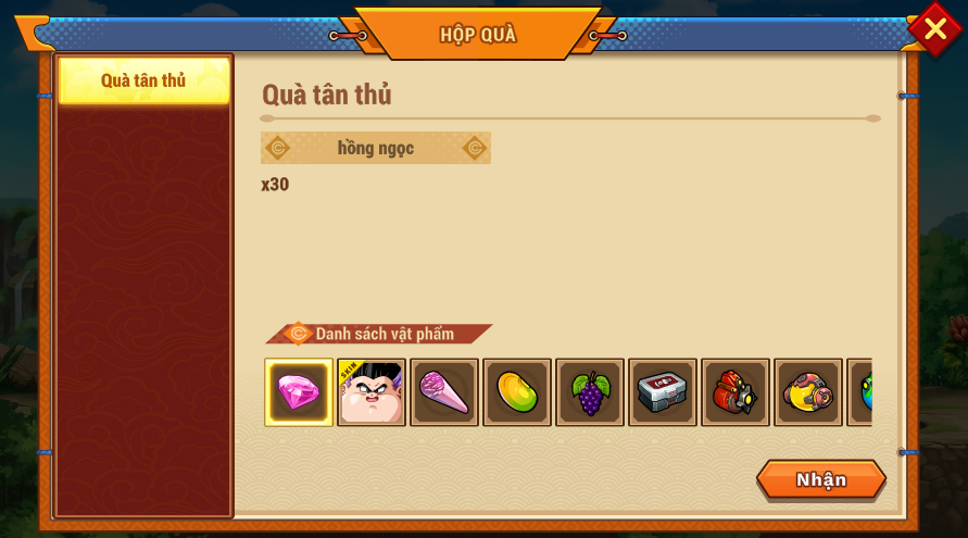 Quà Tân Thủ: 30 Hồng Ngọc, Cải trang Gotenks (14 ngày), Phụ kiện bay Cột nhà (14 ngày), x60 Đậu thần cấp 5, x5 Nho tím, x30 Capsule bay, x10 vệ tinh sinh lực trí lực phòng thủ, x1 Phiếu giảm giá, Danh hiệu Ngọc Rồng Awaken (30 ngày)